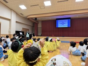 まずはホールで餅つきについてのお話しやもちつきについてのクイズやもちつきの歌をみんなで歌いました。そこでうるち米と、もち米の違いについてもみんなで比べてみましたよ。