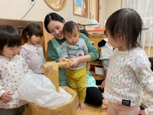 0.1歳児のお友だちも部屋で手作りうすで餅つき練習をしましたよ☆