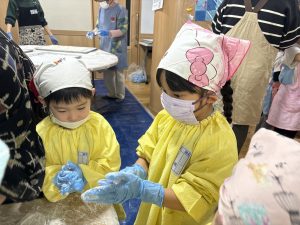 年長さんはお家の方などにご協力いただき、一緒につきました。